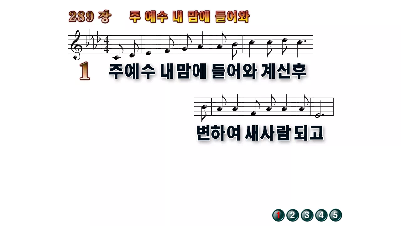 새찬송가 '289장 주 예수 내 맘에 들어와'16:9 와이드버전으로 편집된 배경 없는 새찬송가 PPT악보입니다.