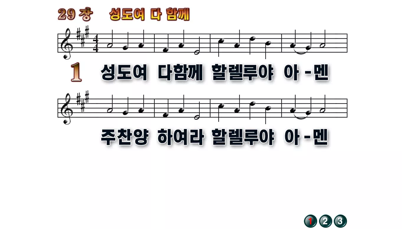 새찬송가 '29장 성도여 다 함께'의 16:9 와이드버전으로 편집된 배경 없는 새찬송가 PPT악보입니다.