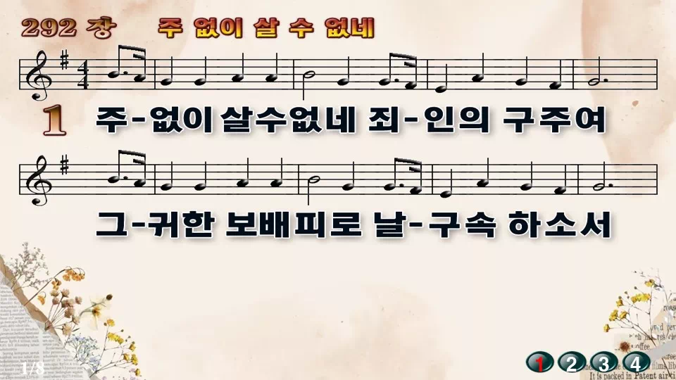 새찬송가 '292장 주 없이 살 수 없네'의 16:9 와이드버전으로 편집된 새찬송가 PPT악보입니다.