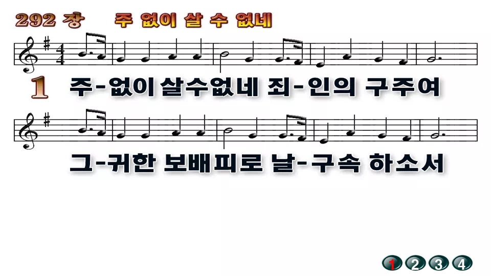 새찬송가 '292장 주 없이 살 수 없네'의 16:9 와이드버전으로 편집된 배경 없는 새찬송가 PPT악보입니다.