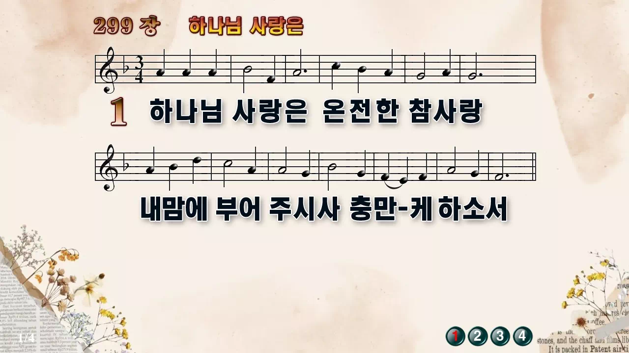 새찬송가 '299장 하나님 사랑은'의 16:9 와이드버전으로 편집된 새찬송가 PPT악보입니다.