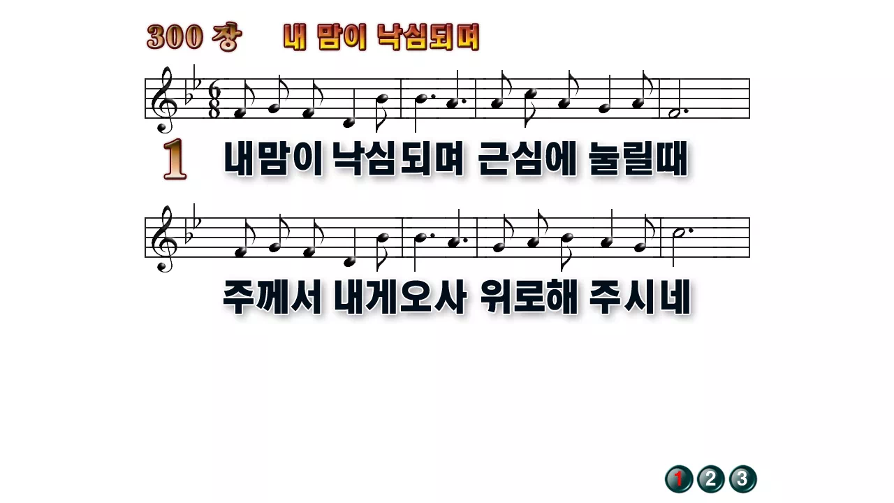 새찬송가 '300장 내 맘이 낙심되며'의 16:9 와이드버전으로 편집된 배경 없는 새찬송가 PPT악보입니다.