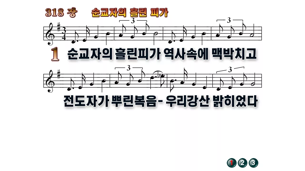새찬송가 '318장 순교자의 흘린 피가'의 16:9 와이드버전으로 편집된 배경 없는 새찬송가 PPT악보입니다.