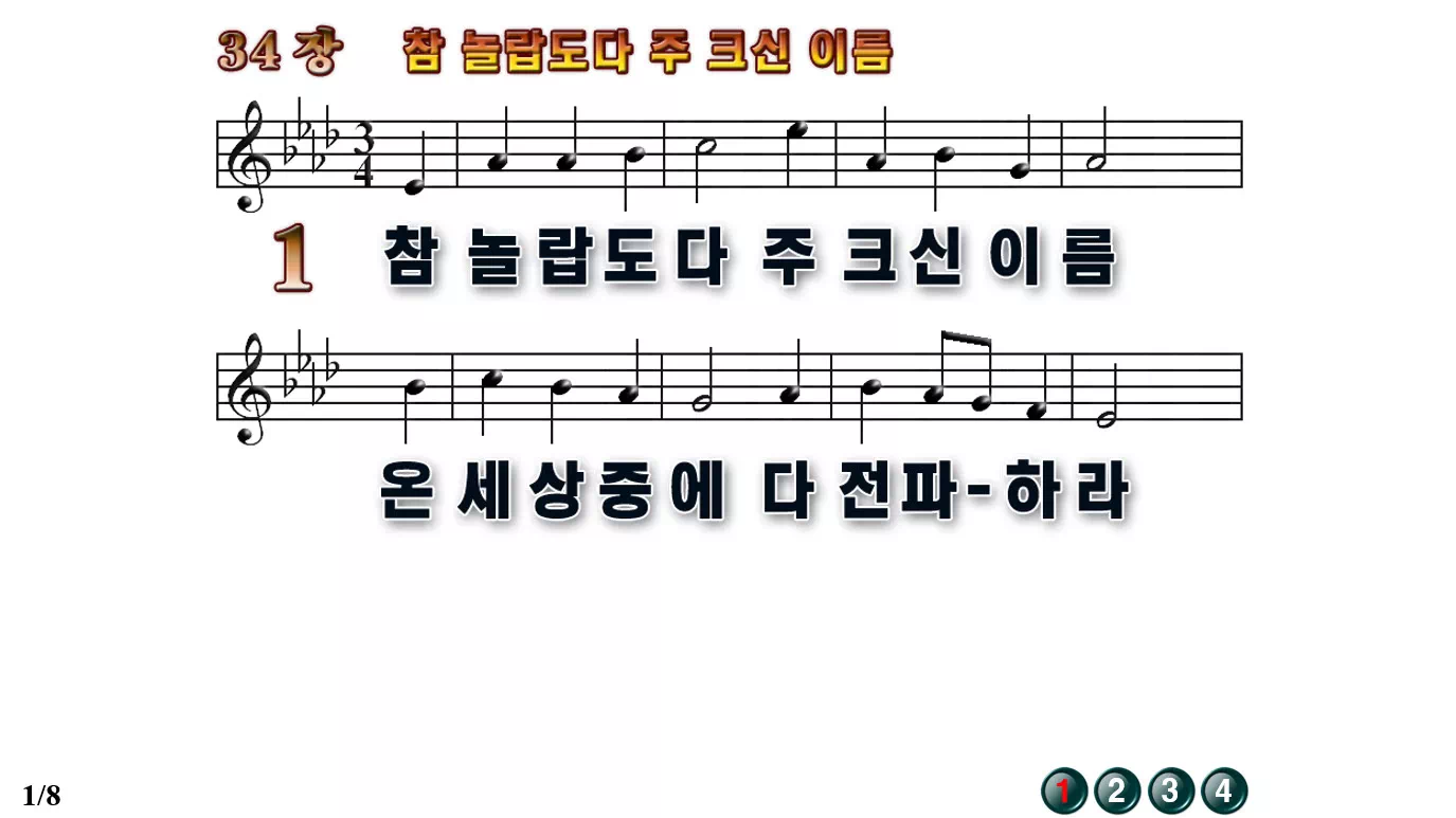 새찬송가 '34장 참 놀랍도다 주 크신 이름'의 16:9 와이드버전으로 편집된 배경 없는 새찬송가 PPT악보입니다.