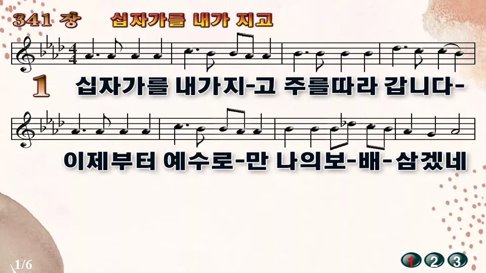 새찬송가 '341장 십자가를 내가 지고'의 16:9 와이드버전으로 편집된 새찬송가 PPT악보입니다.