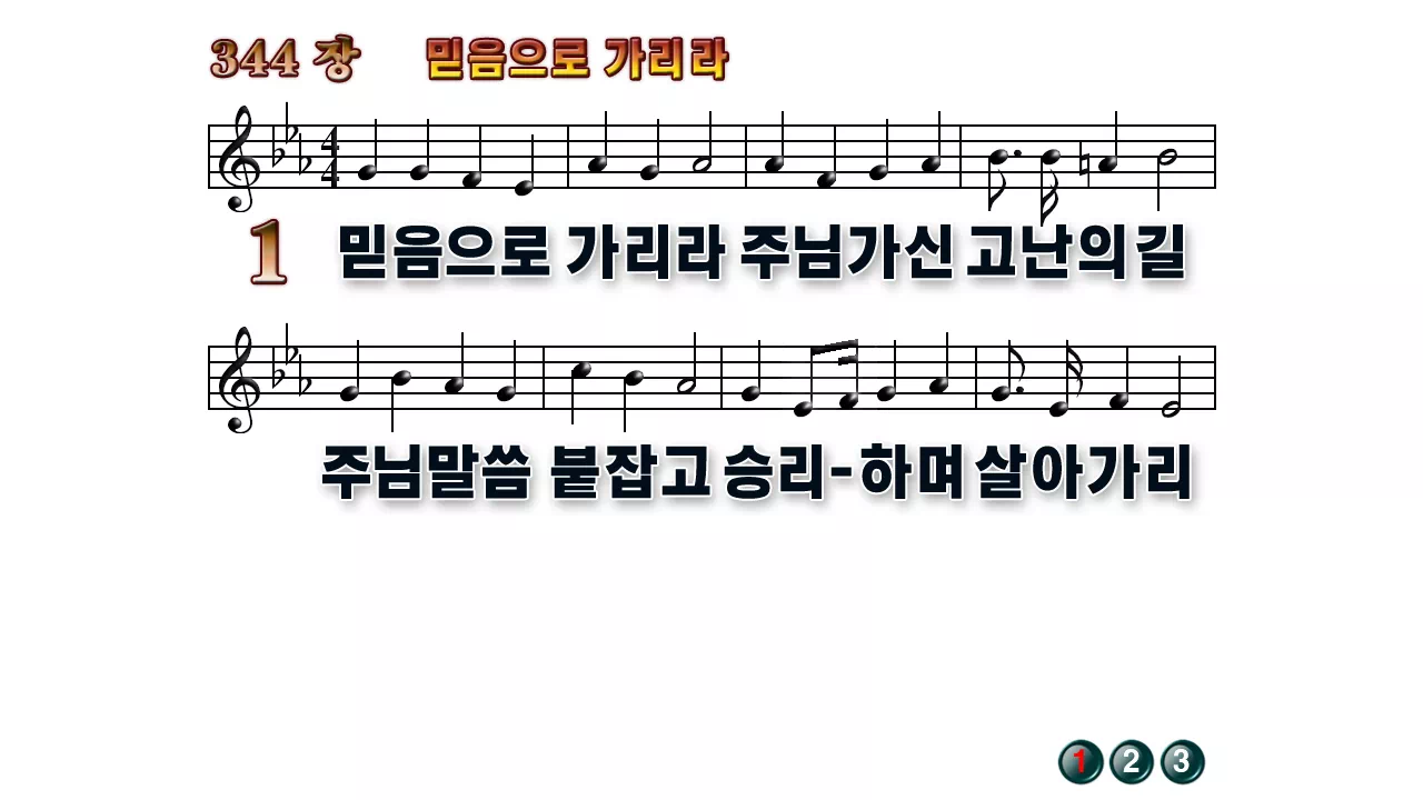 새찬송가 '344장 믿음으로 가리라'의 16:9 와이드버전으로 편집된 배경 없는 새찬송가 PPT악보입니다.