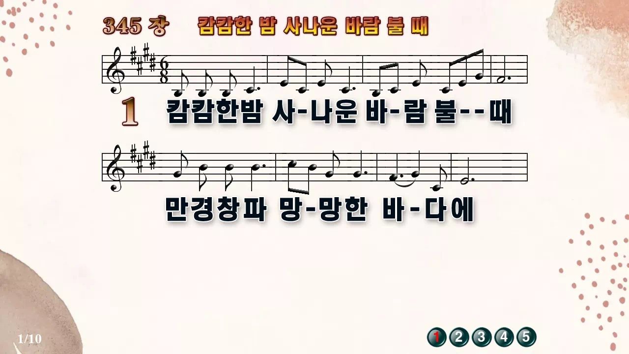 새찬송가 '345장 캄캄한 밤 사나운 바람 불 때'의 16:9 와이드버전으로 편집된 새찬송가 PPT악보입니다.