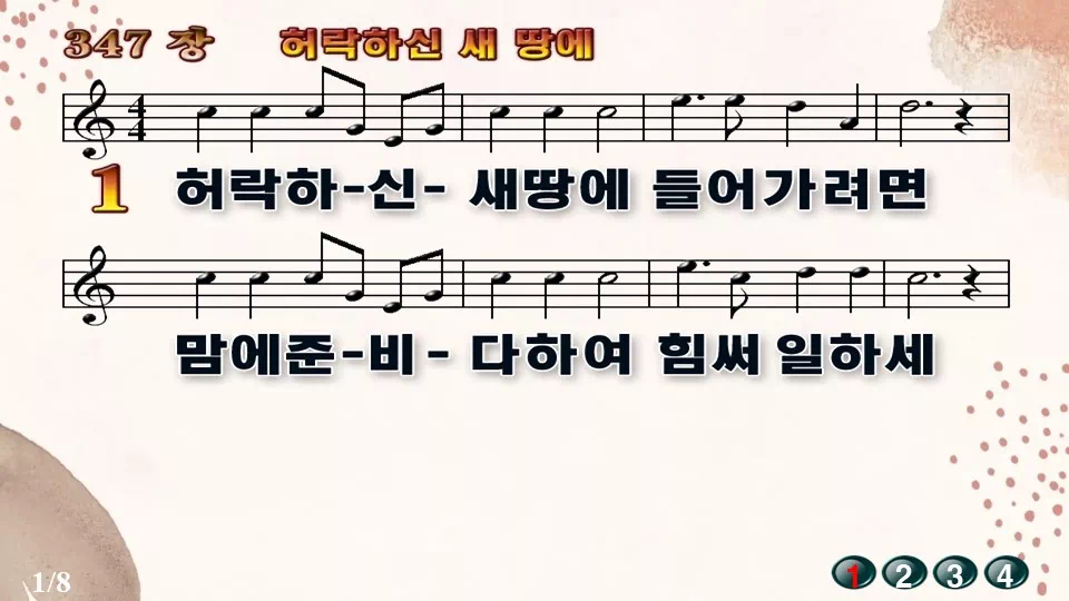 새찬송가 '347장 허락하신 새 땅에'의 16:9 와이드버전으로 편집된 새찬송가 PPT악보입니다.