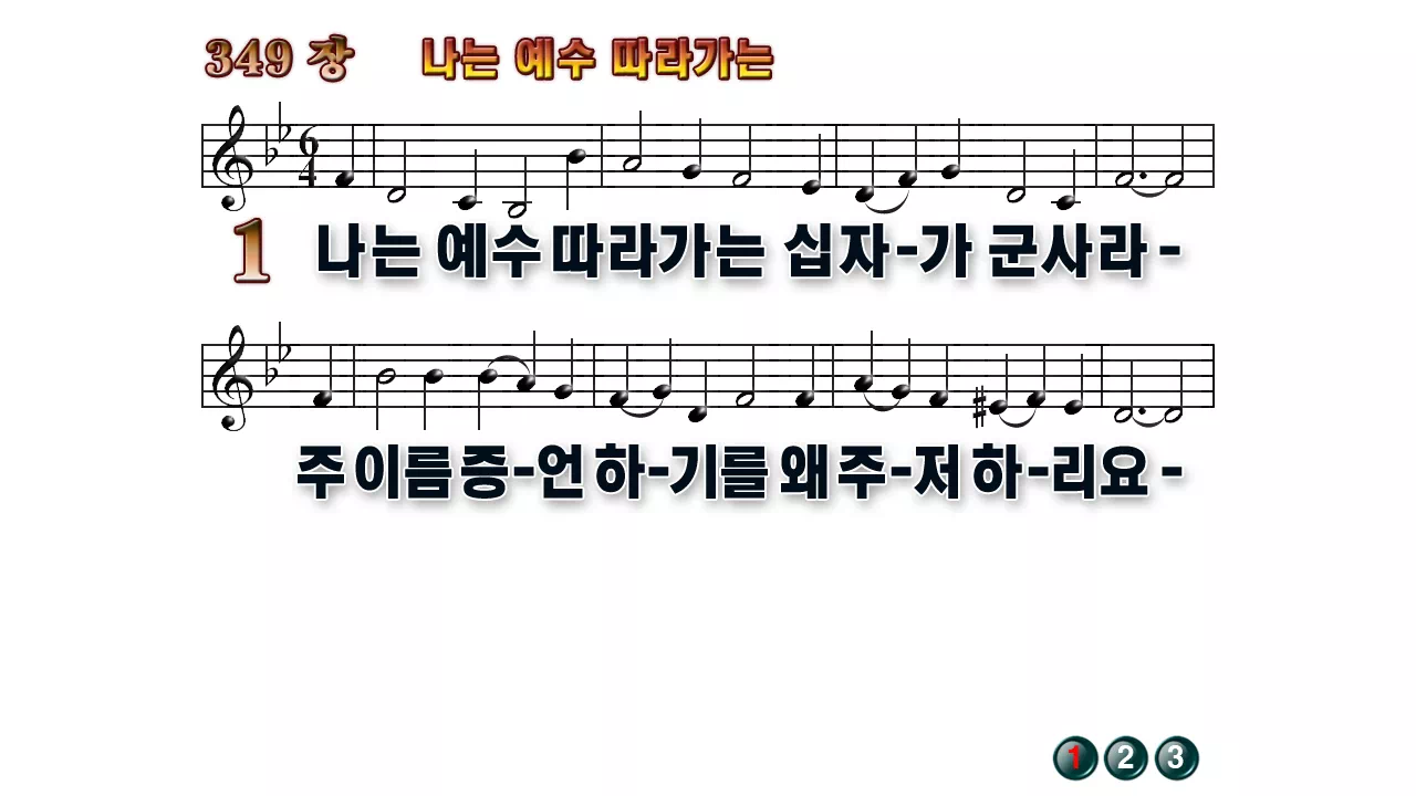 새찬송가 '349장 나는 예수 따라가는'의 16:9 와이드버전으로 편집된 배경 없는 새찬송가 PPT악보입니다.
