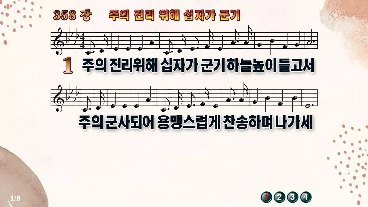 새찬송가 '358장 주의 진리 위해 십자가 군기'의 16:9 와이드버전으로 편집된 새찬송가 PPT악보입니다.