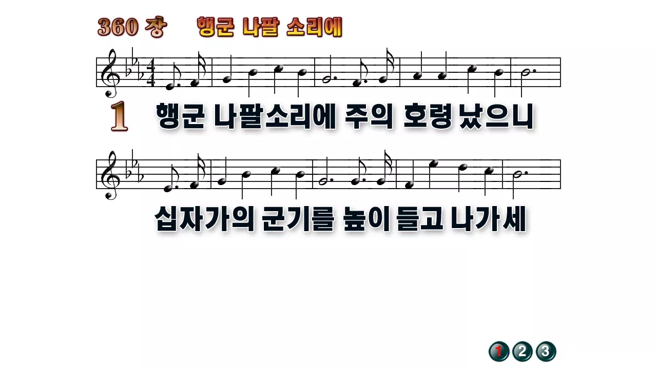 새찬송가 '360장 행군 나팔 소리에'의 16:9 와이드버전으로 편집된 배경 없는 새찬송가 PPT악보입니다.