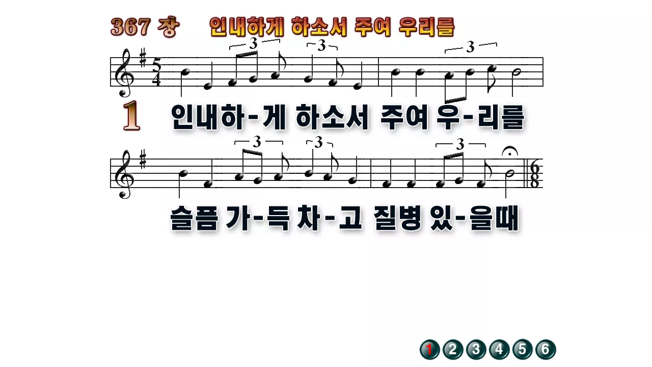 새찬송가 '367장 인내하게 하소서 주여 우리를'의 16:9 와이드버전으로 편집된 배경 없는 새찬송가 PPT악보입니다.