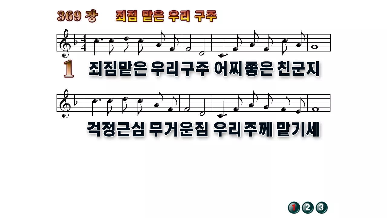 새찬송가 '369장 죄 짐 맡은 우리구주'16:9 와이드버전으로 편집된 배경 없는 새찬송가 PPT악보입니다.