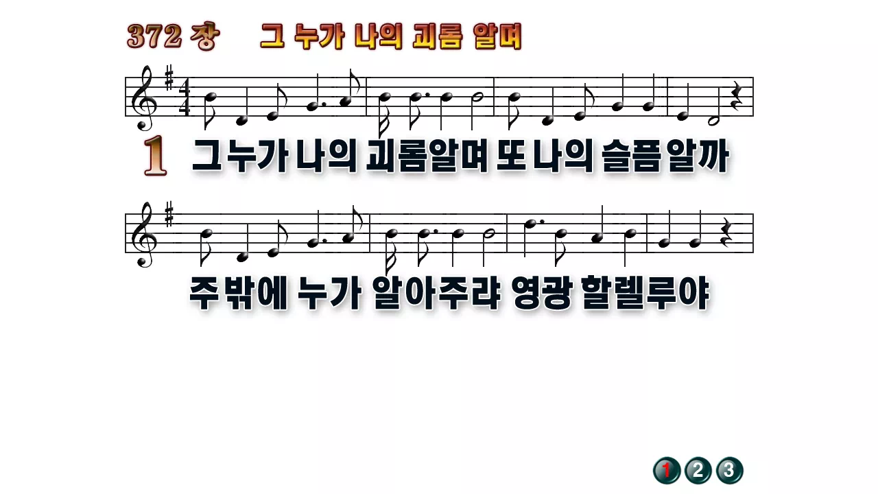 새찬송가 '372장 그 누가 나의 괴롬 알며'의 16:9 와이드버전으로 편집된 배경 없는 새찬송가 PPT악보입니다.