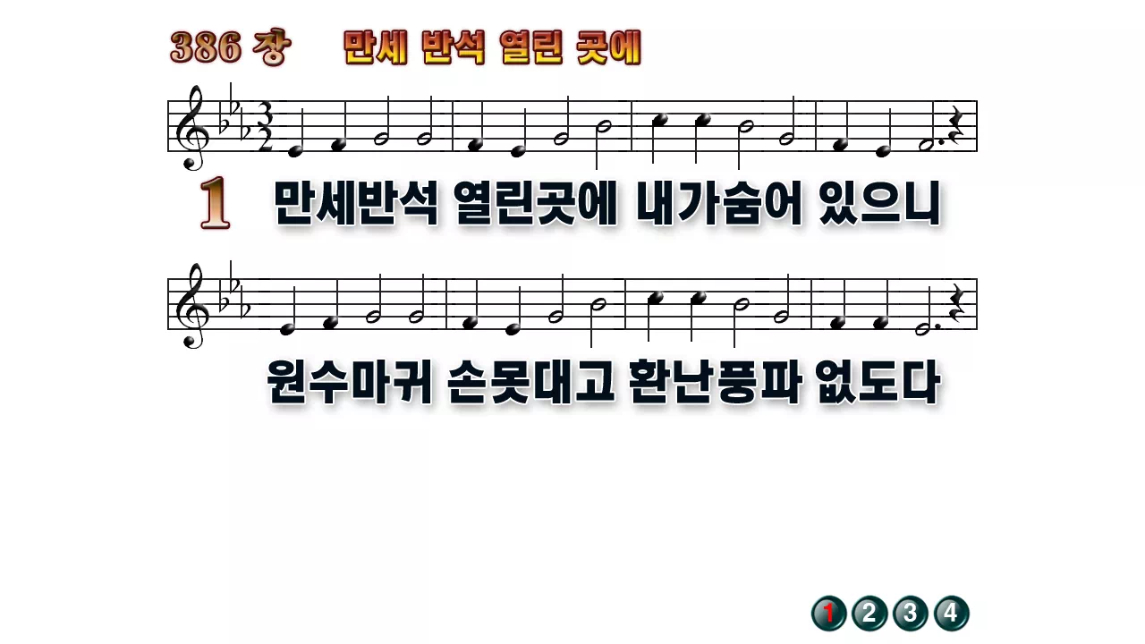 새찬송가 '386장 만세 반석 열린곳에'의 16:9 와이드버전으로 편집된 배경 없는 새찬송가 PPT악보입니다.