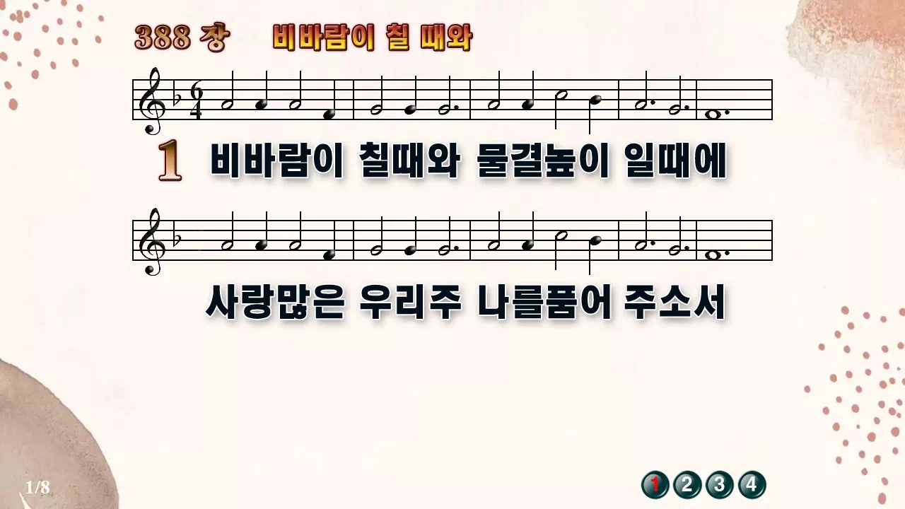 새찬송가 '388장 비바람이 칠때와'의 16:9 와이드버전으로 편집된 새찬송가 PPT악보입니다.