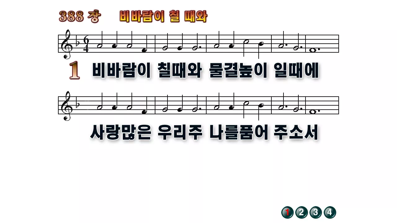 새찬송가 '388장 비바람이 칠때와'의 16:9 와이드버전으로 편집된 배경 없는 새찬송가 PPT악보입니다.