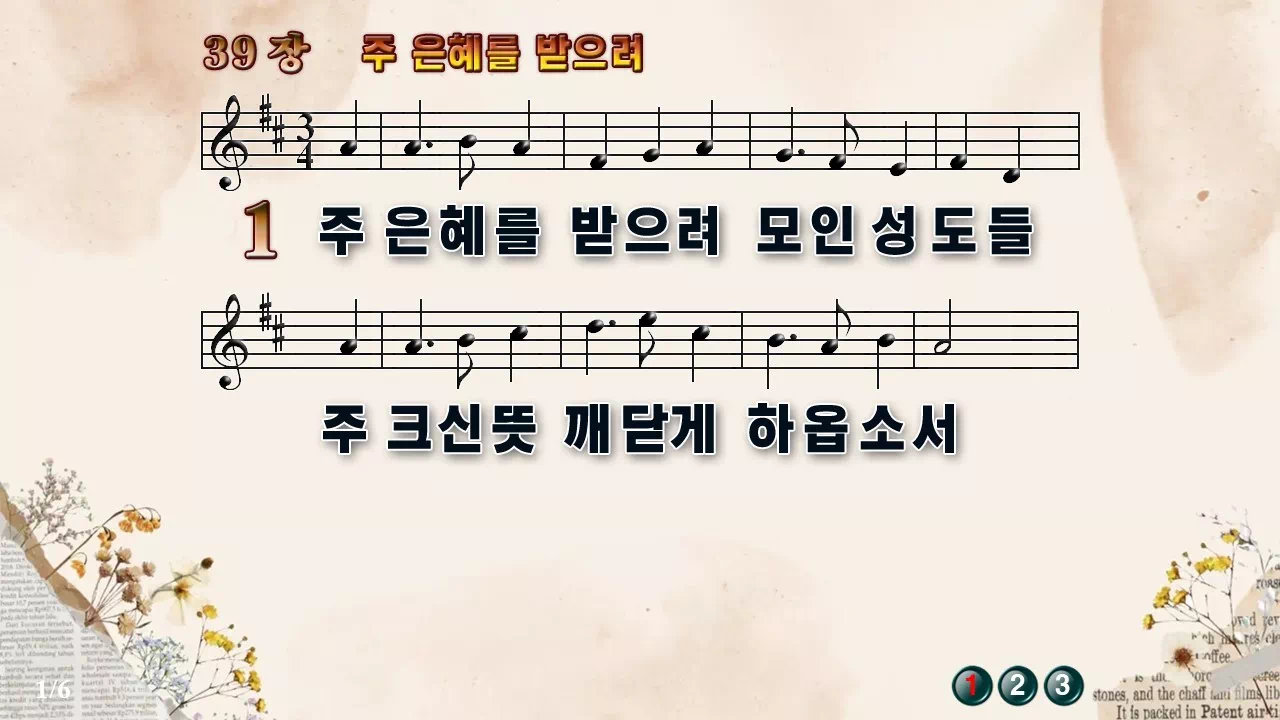 새찬송가 '39장 주 은혜를 받으려'의 16:9 와이드버전으로 편집된 새찬송가 PPT악보입니다.