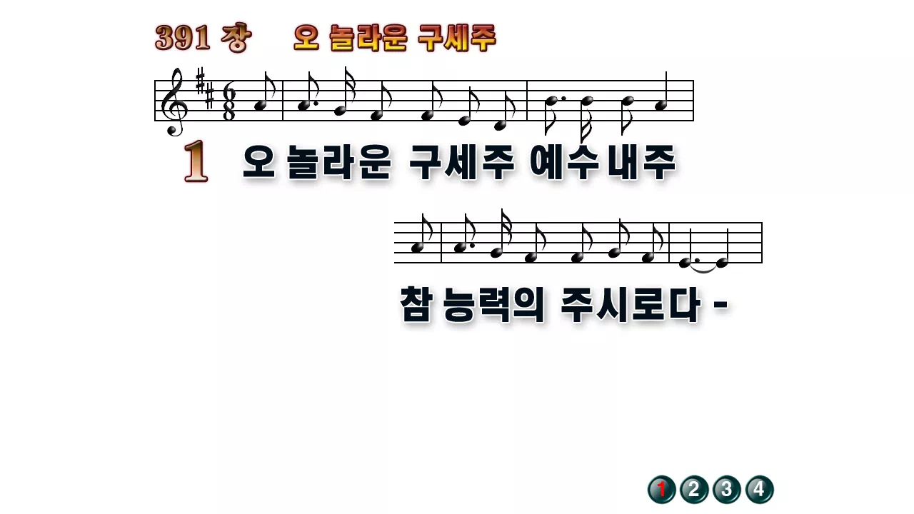 새찬송가 '391장 오 놀라운 구세주'의 16:9 와이드버전으로 편집된 배경 없는 새찬송가 PPT악보입니다.