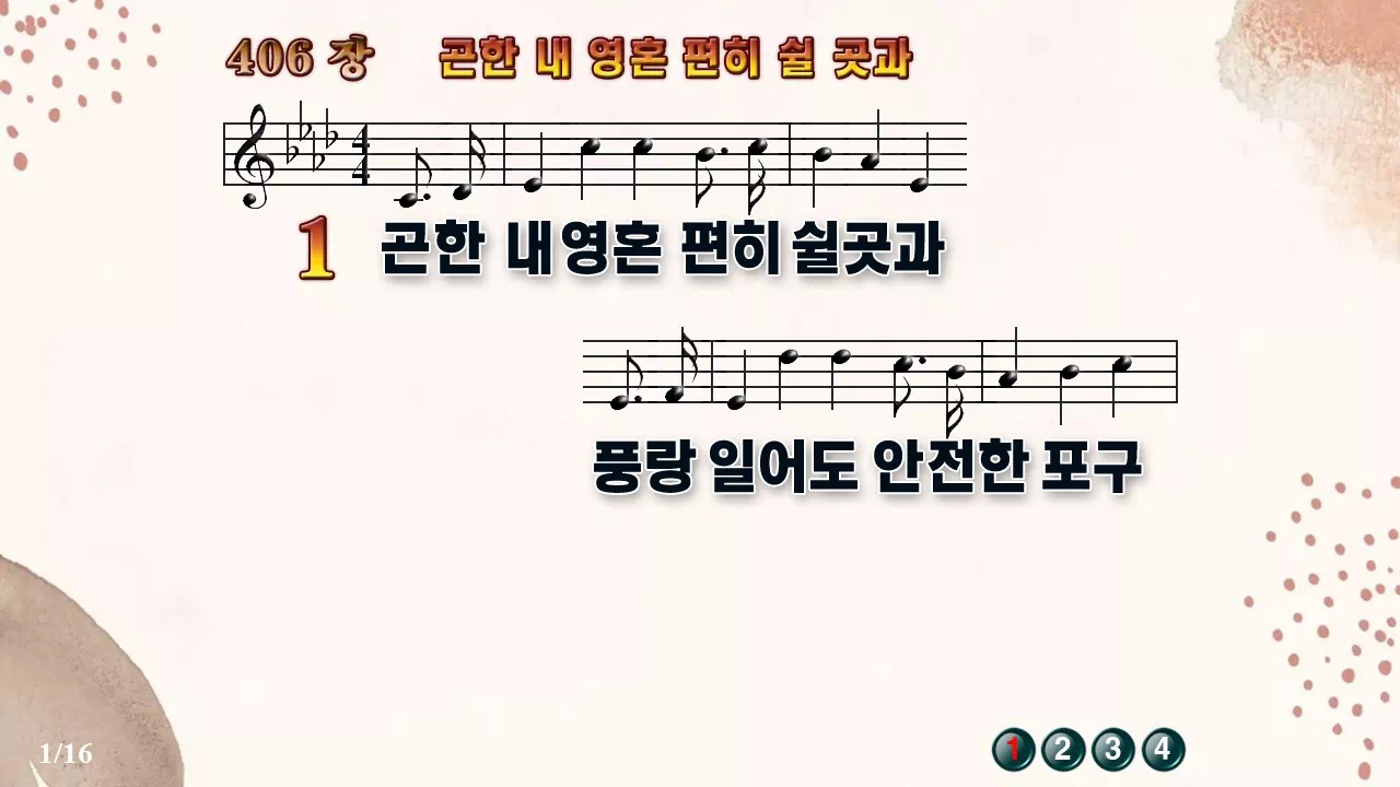 새찬송가 '406장 곤한 내영혼 편히 쉴 곳과'의 16:9 와이드버전으로 편집된 새찬송가 PPT악보입니다.