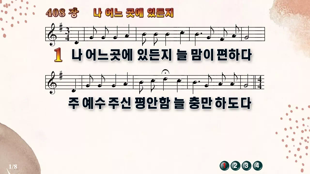 새찬송가 '408장 나 어느 곳에 있든지'의 16:9 와이드버전으로 편집된 새찬송가 PPT악보입니다.