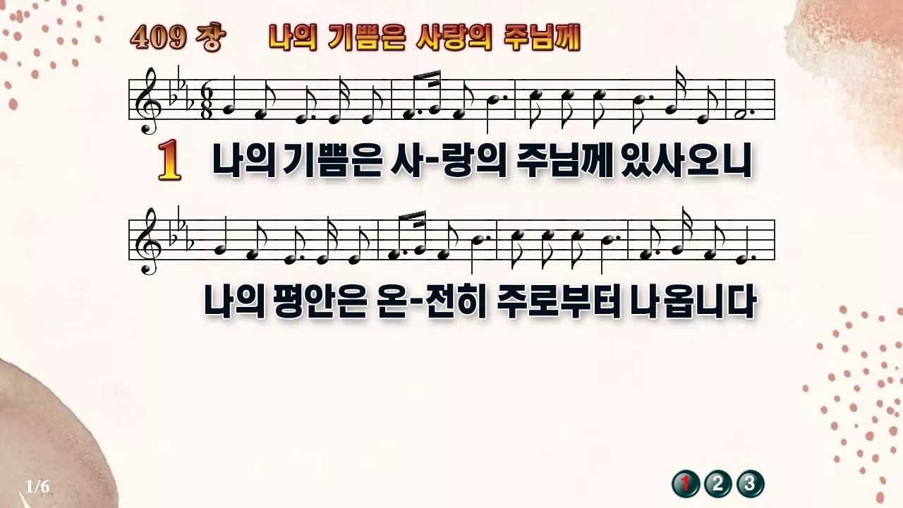 새찬송가 '409장 나의 기쁨은 사랑의 주님께'의 16:9 와이드버전으로 편집된 새찬송가 PPT악보입니다.
