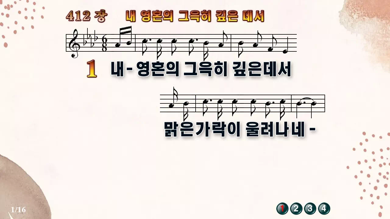 새찬송가 '412장 내 영혼의 그윽히 깊은데서'의 16:9 와이드버전으로 편집된 새찬송가 PPT악보입니다.