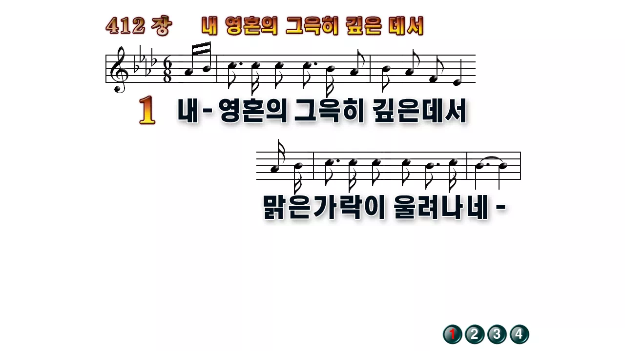 새찬송가 '412장 내 영혼의 그윽히 깊은데서'의 16:9 와이드버전으로 편집된 배경 없는 새찬송가 PPT악보입니다.