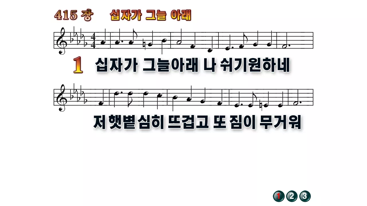 새찬송가 '415장 십자가 그늘 아래'16:9 와이드버전으로 편집된 배경 없는 새찬송가 PPT악보입니다.