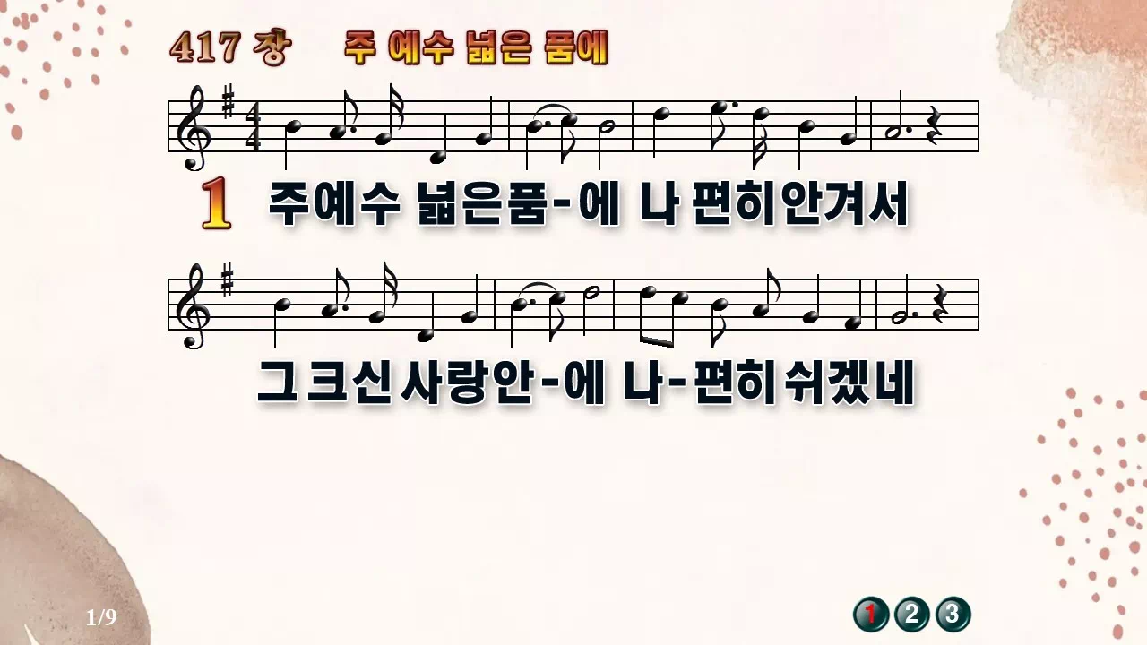 새찬송가 '417장 주 예수 넓은 품에'의 16:9 와이드버전으로 편집된 새찬송가 PPT악보입니다.
