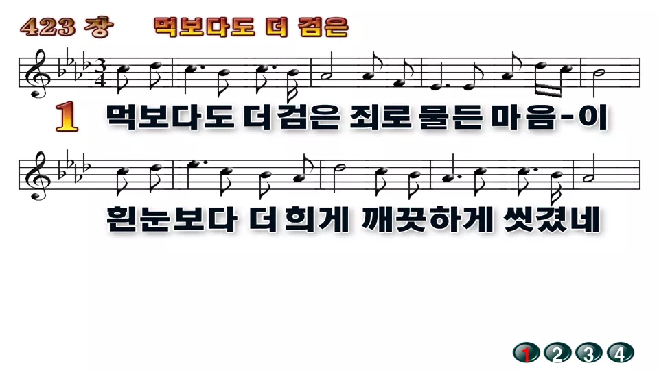 새찬송가 '423장 먹보다도 더 검은'의 16:9 와이드버전으로 편집된 배경 없는 새찬송가 PPT악보입니다.