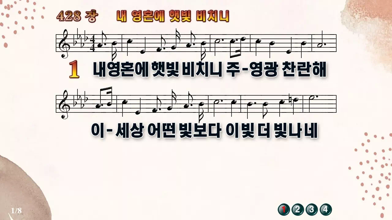 새찬송가 '428장 내 영혼에 햇빛 비치니'16:9 와이드버전으로 편집된 새찬송가 PPT악보입니다.