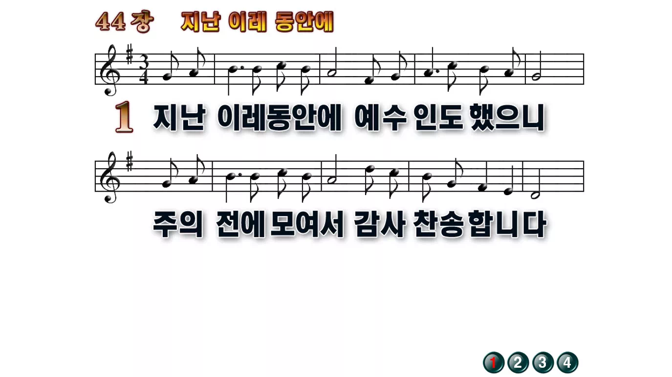 새찬송가 '44장 지난 이레 동안에'의 16:9 와이드버전으로 편집된 배경 없는 새찬송가 PPT악보입니다.