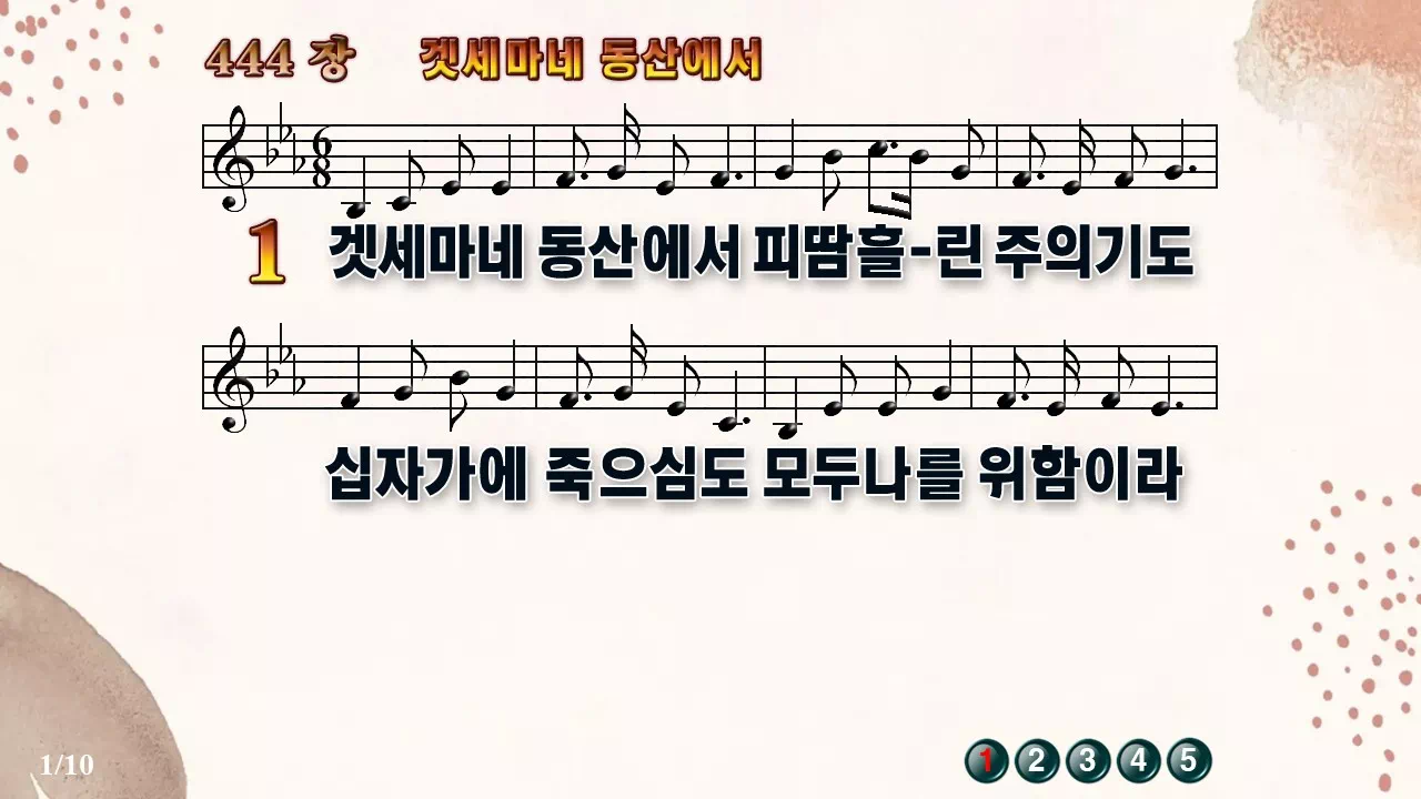 새찬송가 '444장 겟세마네 동산에서'의 16:9 와이드버전으로 편집된 새찬송가 PPT악보입니다.