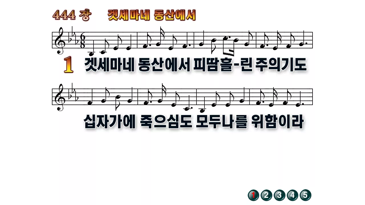 새찬송가 '444장 겟세마네 동산에서'의 16:9 와이드버전으로 편집된 배경 없는 새찬송가 PPT악보입니다.