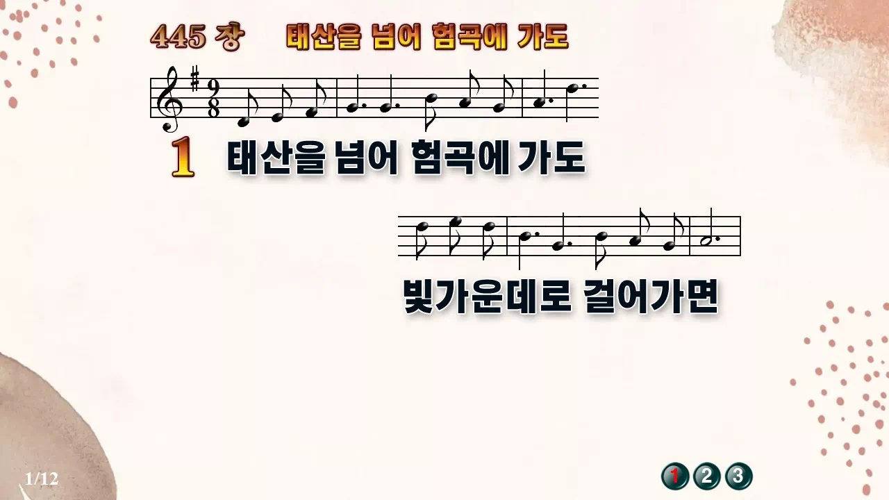 새찬송가 '445장 태산을 넘어 험곡에 가도'의 16:9 와이드버전으로 편집된 새찬송가 PPT악보입니다.