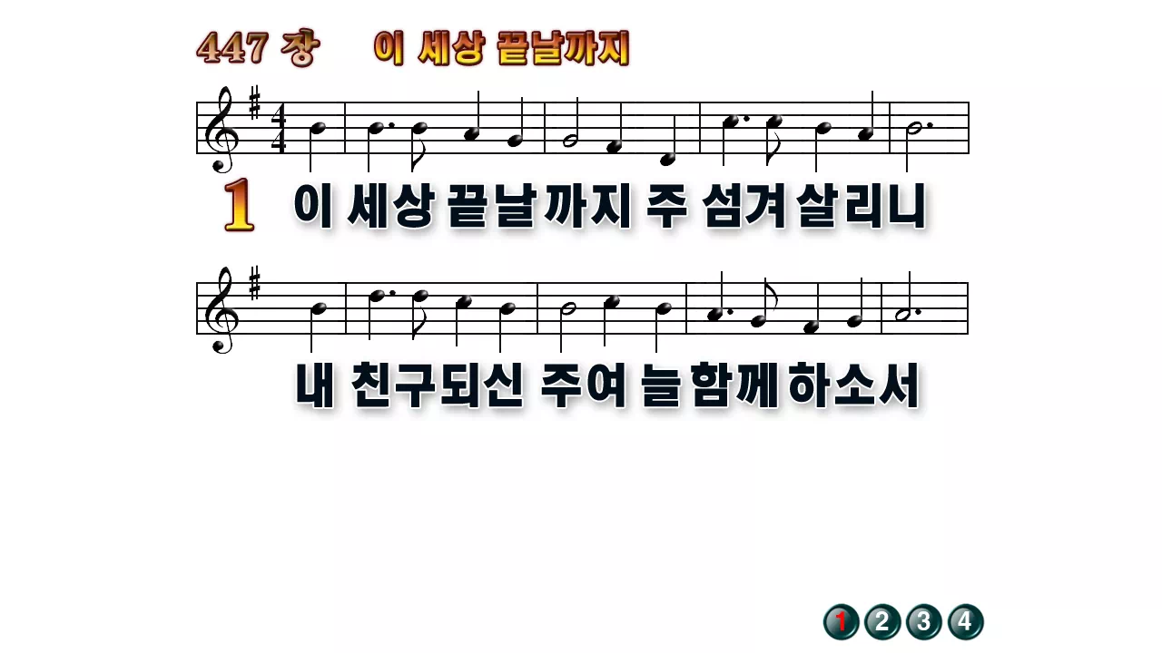 새찬송가 '447장 이 세상 끝날까지'의 16:9 와이드버전으로 편집된 배경 없는 새찬송가 PPT악보입니다.