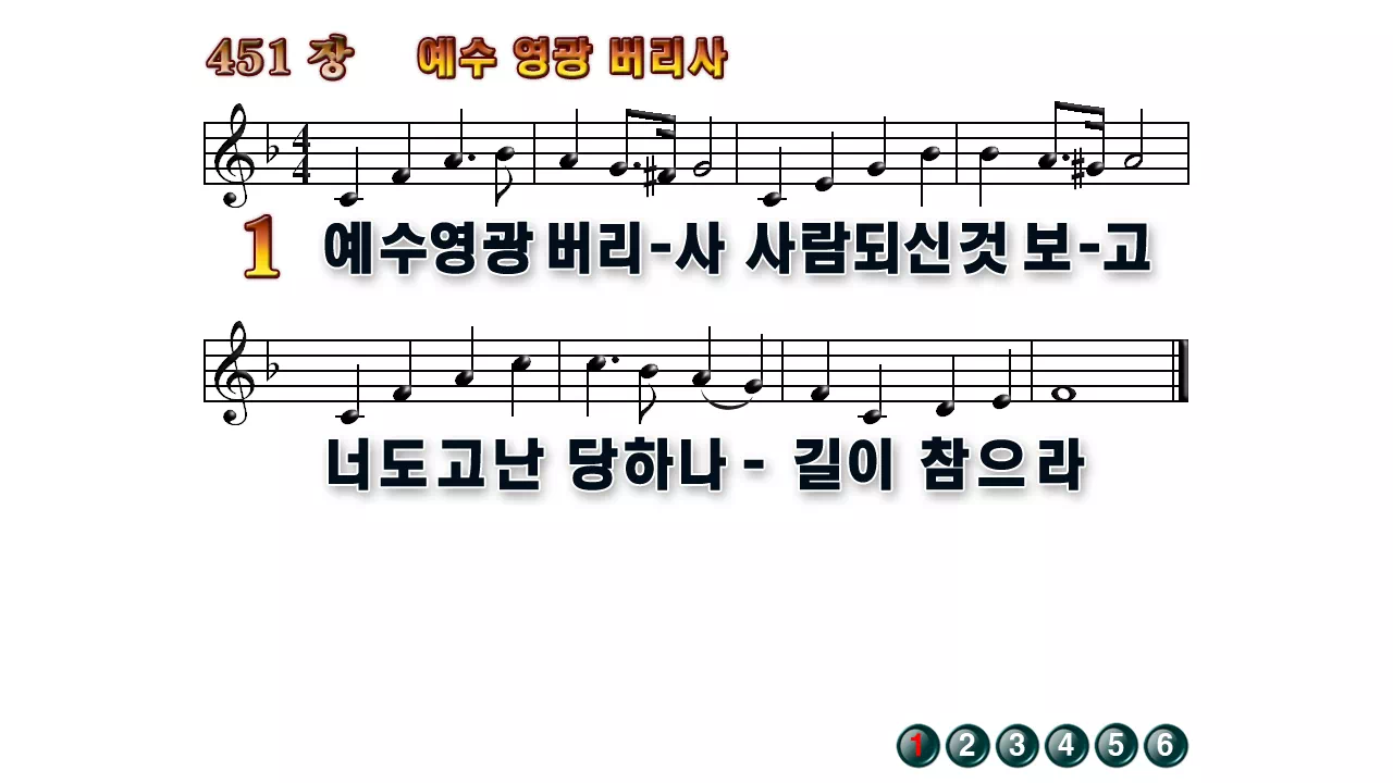 새찬송가 '451장 예수 영광 버리사'의 16:9 와이드버전으로 편집된 배경 없는 새찬송가 PPT악보입니다.