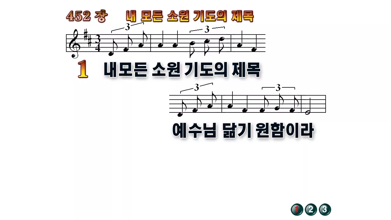 새찬송가 '452장 내 모든 소원 기도의 제목'16:9 와이드버전으로 편집된 배경 없는 새찬송가 PPT악보입니다.