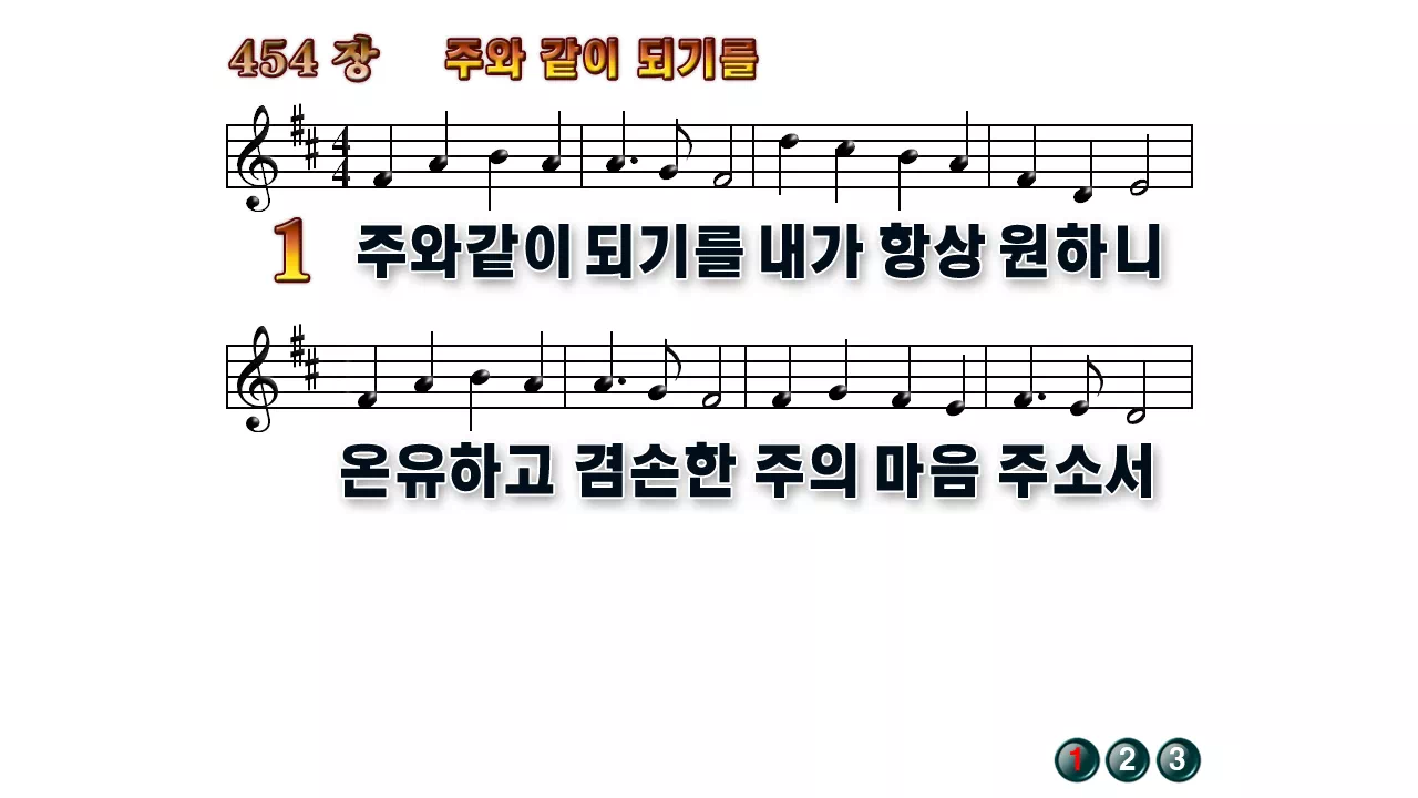 새찬송가 '454장 주와 같이 되기를'의 16:9 와이드버전으로 편집된 배경 없는 새찬송가 PPT악보입니다.