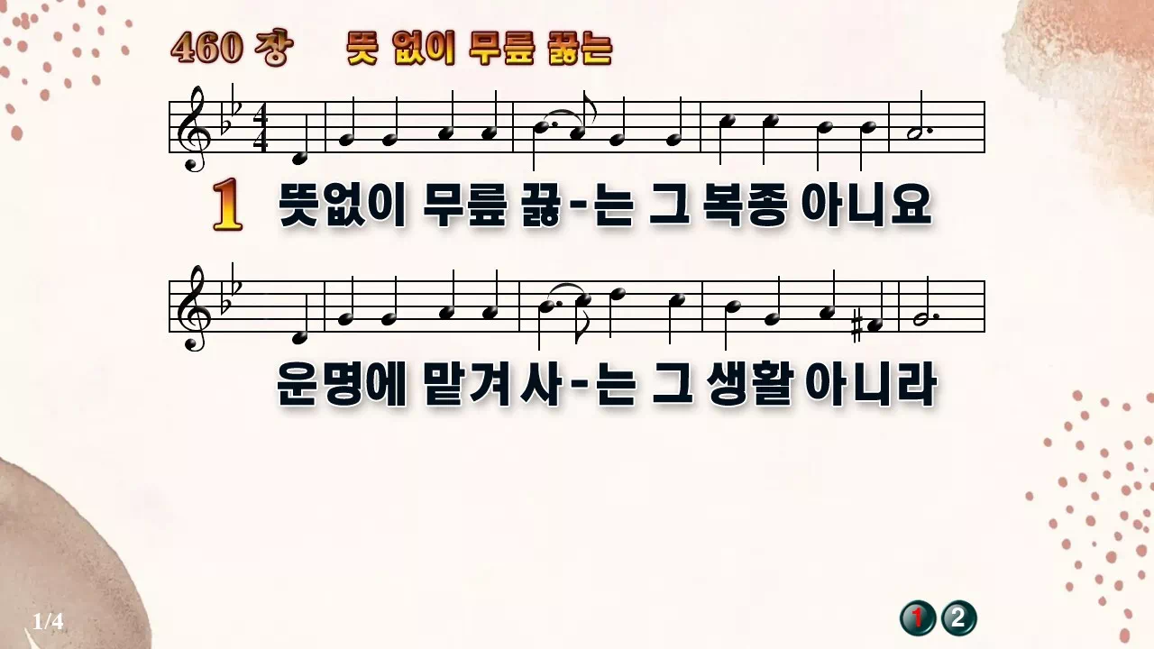 새찬송가 '460장 뜻 없이 무릎 꿇는'의 16:9 와이드버전으로 편집된 새찬송가 PPT악보입니다.