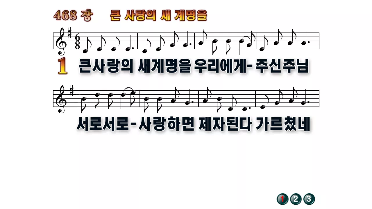 새찬송가 '468장 큰 사랑의 새 계명을'16:9 와이드버전으로 편집된 배경 없는 새찬송가 PPT악보입니다.