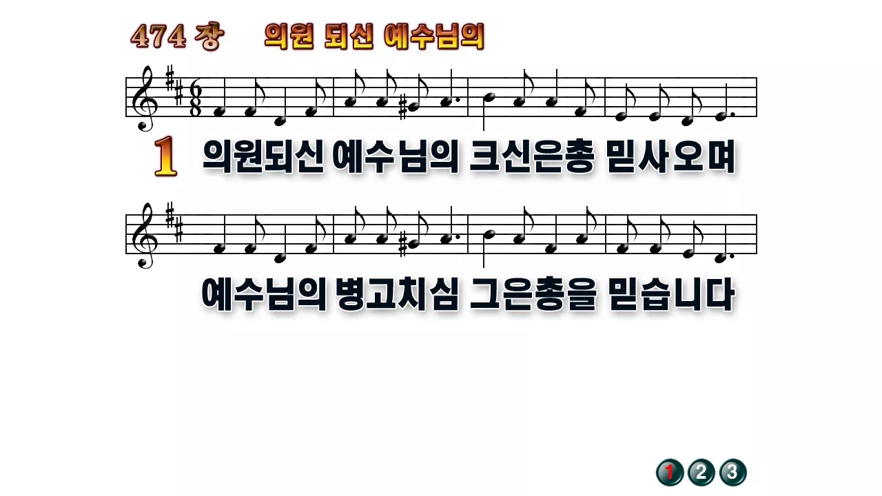 새찬송가 '474장 의원되신 예수님의'의 16:9 와이드버전으로 편집된 배경 없는 새찬송가 PPT악보입니다.