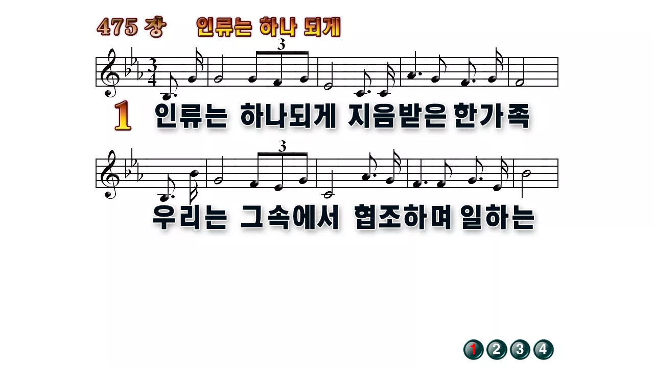새찬송가 '475장 인류는 하나되게'의 16:9 와이드버전으로 편집된 배경 없는 새찬송가 PPT악보입니다.