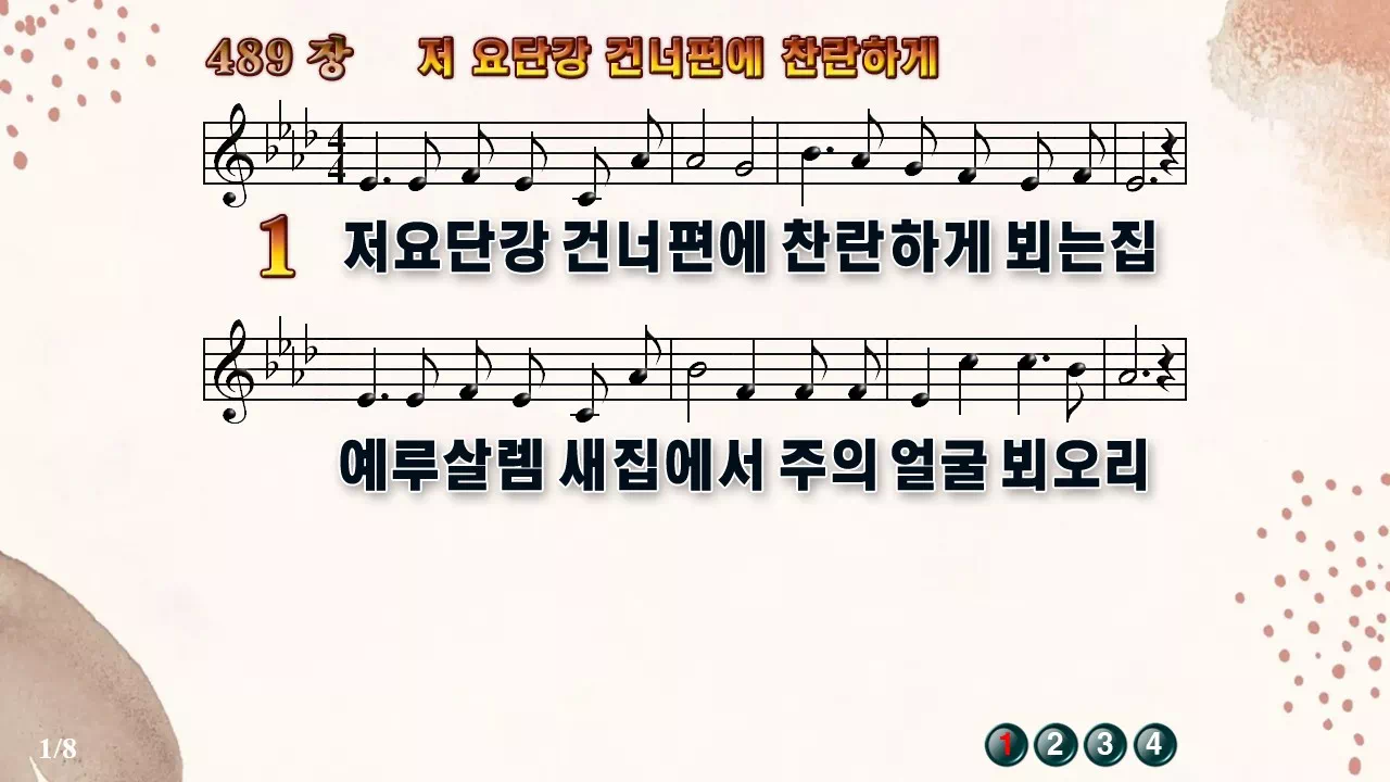 새찬송가 '489장 저 요단강 건너편에 찬란하게'의 16:9 와이드버전으로 편집된 새찬송가 PPT악보입니다.