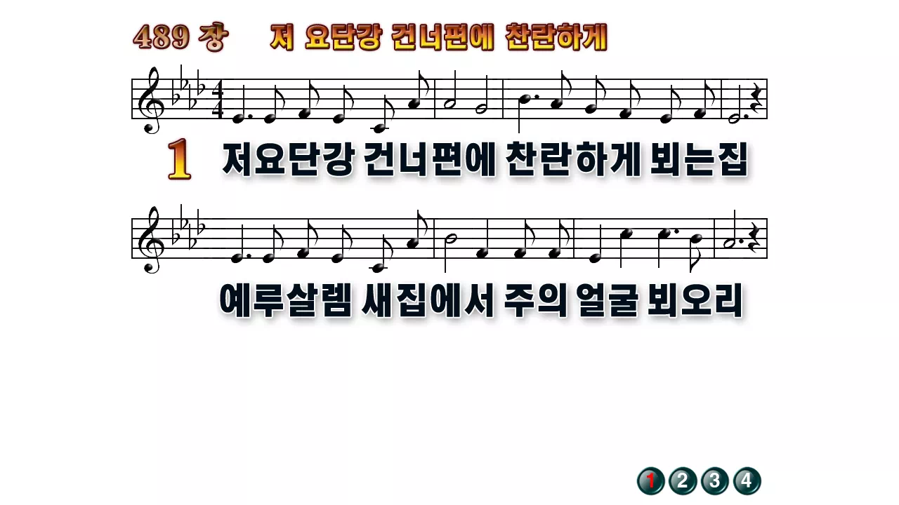 새찬송가 '489장 저 요단강 건너편에 찬란하게'의 16:9 와이드버전으로 편집된 배경 없는 새찬송가 PPT악보입니다.