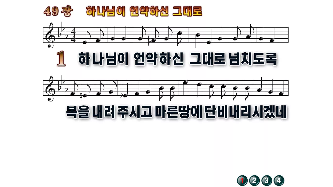 새찬송가 '49장 하나님이 언약하신 그대로'의 16:9 와이드버전으로 편집된 배경 없는 새찬송가 PPT악보입니다.