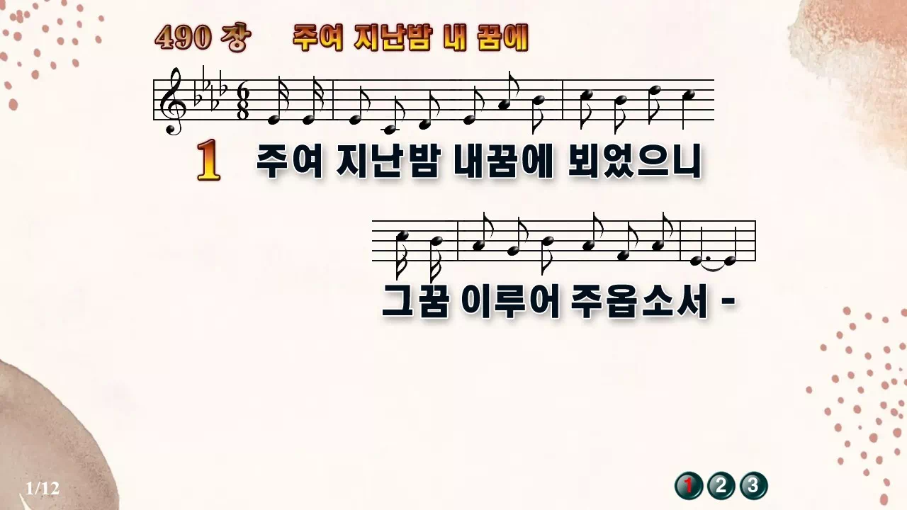 새찬송가 '490장 주여 지난 밤 내꿈에'의 16:9 와이드버전으로 편집된 새찬송가 PPT악보입니다.
