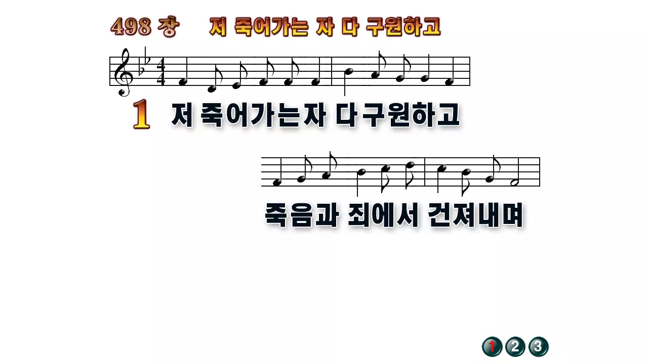 새찬송가 '498장 저 죽어가는 자 다 구원하고'16:9 와이드버전으로 편집된 배경 없는 새찬송가 PPT악보입니다.
