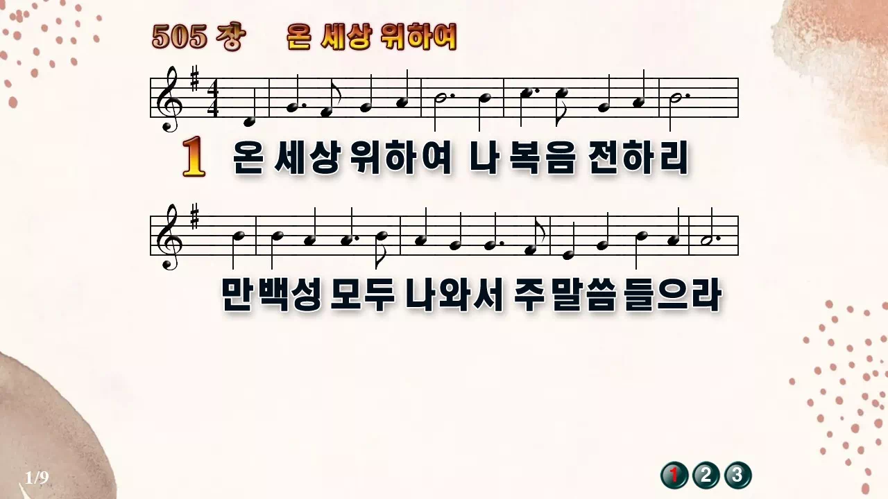 새찬송가 '505장 온 세상 위하여'의 16:9 와이드버전으로 편집된 새찬송가 PPT악보입니다.